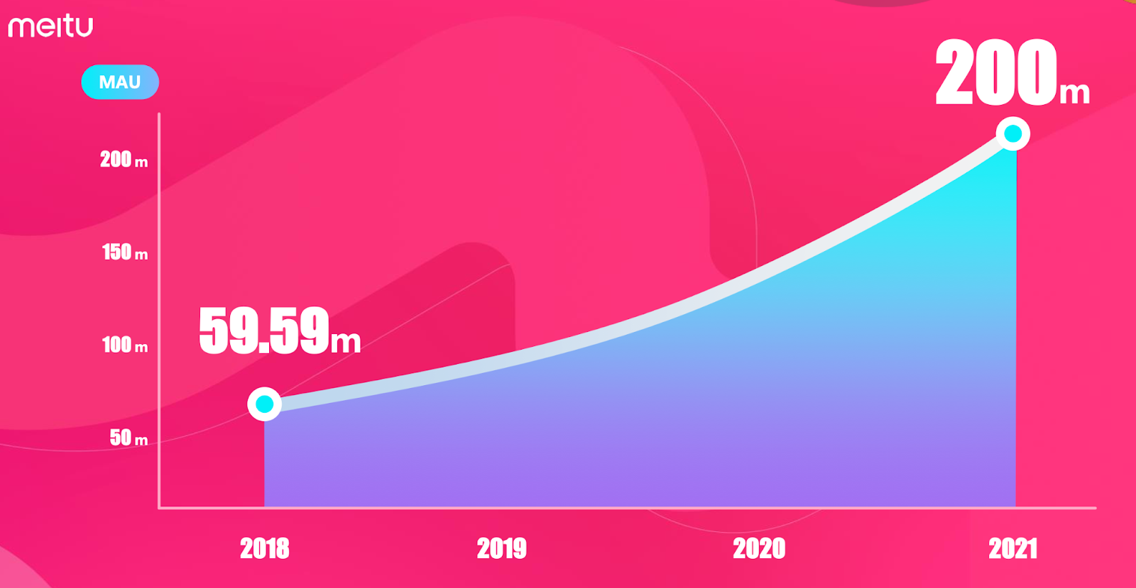 ในปี 2018 ยอดผู้ใช้งานแอปแต่งรูป Meitu มีจำนวน 59.59 ล้านคนต่อเดือน และได้เพิ่มขึ้นไปถึง 261 ล้านคนต่อเดือนในปี 2021 จากที่ตั้งเป้าไว้ 200 ล้านคน ซึ่งอัตราการเติบโตของจำนวนผู้ใช้งาน Meitu ต่อเดือนอยู่ที่ 262% เนื่องจากสามารถตอบโจทย์ความต้องการของผู้ใช้งาน โดยการมอบคุณค่า และแก้ปัญหา Pain Points ที่ต้องการทำให้พวกเขาเหล่านั้นมีรูปลักษณ์ที่ดี ผ่านการใช้แอปแต่งรูปที่ง่าย และสะดวกสบายยิ่งขึ้น